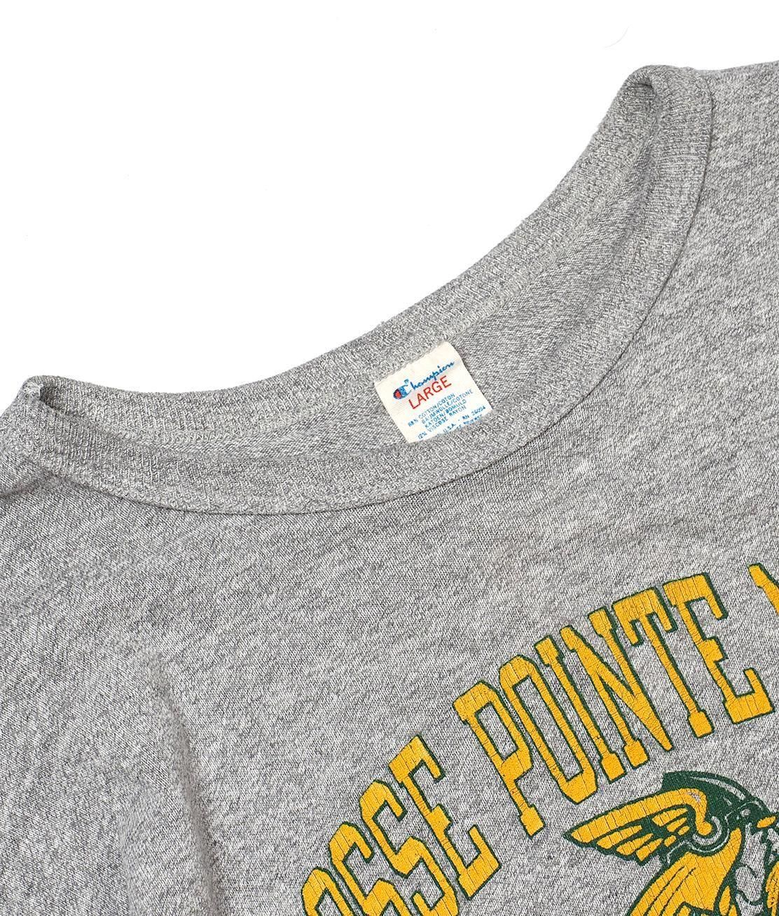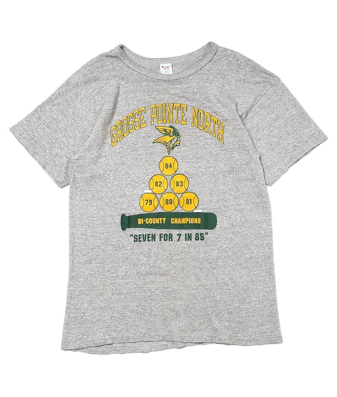 ヴィンテージアイテムの中では好きな方も多いChampion(チャンピオン)のカレッジTシャツ。こちらは1980年代にChampionで使用されていたトリコロールカラーのタグ(通称:トリコタグ)がつくオリジナルヴィンテージになります。1984年頃〜1985年頃の後期トリコタグで「MADE IN U.S.A.」です。ヴィンテージ市場でも非常に人気の高い「88/12」ボディーで、これはコットン88%にレーヨンが12%ブレンドされたボディーで、レーヨンがブレンドされることで肌触りが滑らかになり、吸湿・放湿性に優れ、生地の毛羽立ちを抑えてプリントの染色性が良いことから、プリント用ボディーとして知られた存在です。着用したときのテロっとソフトなボディーは一枚でも着用可能で、シャツやジャケットのインナーとして色々なコーディネートをお楽しみいただけます。首回りはバインダーネック、脇下は丸胴編み、袖や裾はシングルステッチです。