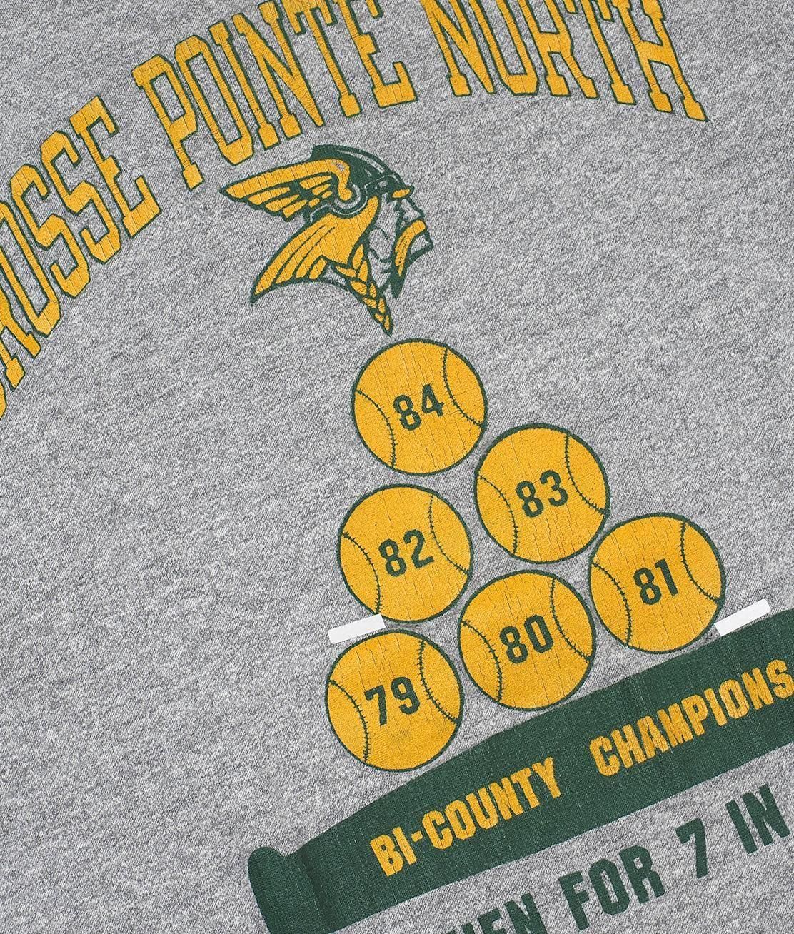 プリントはベースボールのチャンピオンシップのグラフィックで、バランスの良い7段プリントと非常に手間のかかるグラフィックです。ラバープリントは経年によるヒビ割れが見られ、新品にはないヴィンテージの雰囲気が最高にクールです。フワッとした軽い生地感やソフトな着心地、そしてラフなネックラインに肩をやや落として着る袖のバランスも魅力です。着丈がやや長めですが、タックインした時のブラウジングが丁度良く、気になる方は乾燥機で縮めて着るのもひとつですね。ヴィンテージ市場では高騰が進むアイテムですが、まだ比較的手に入れやすいうちにお試しください!