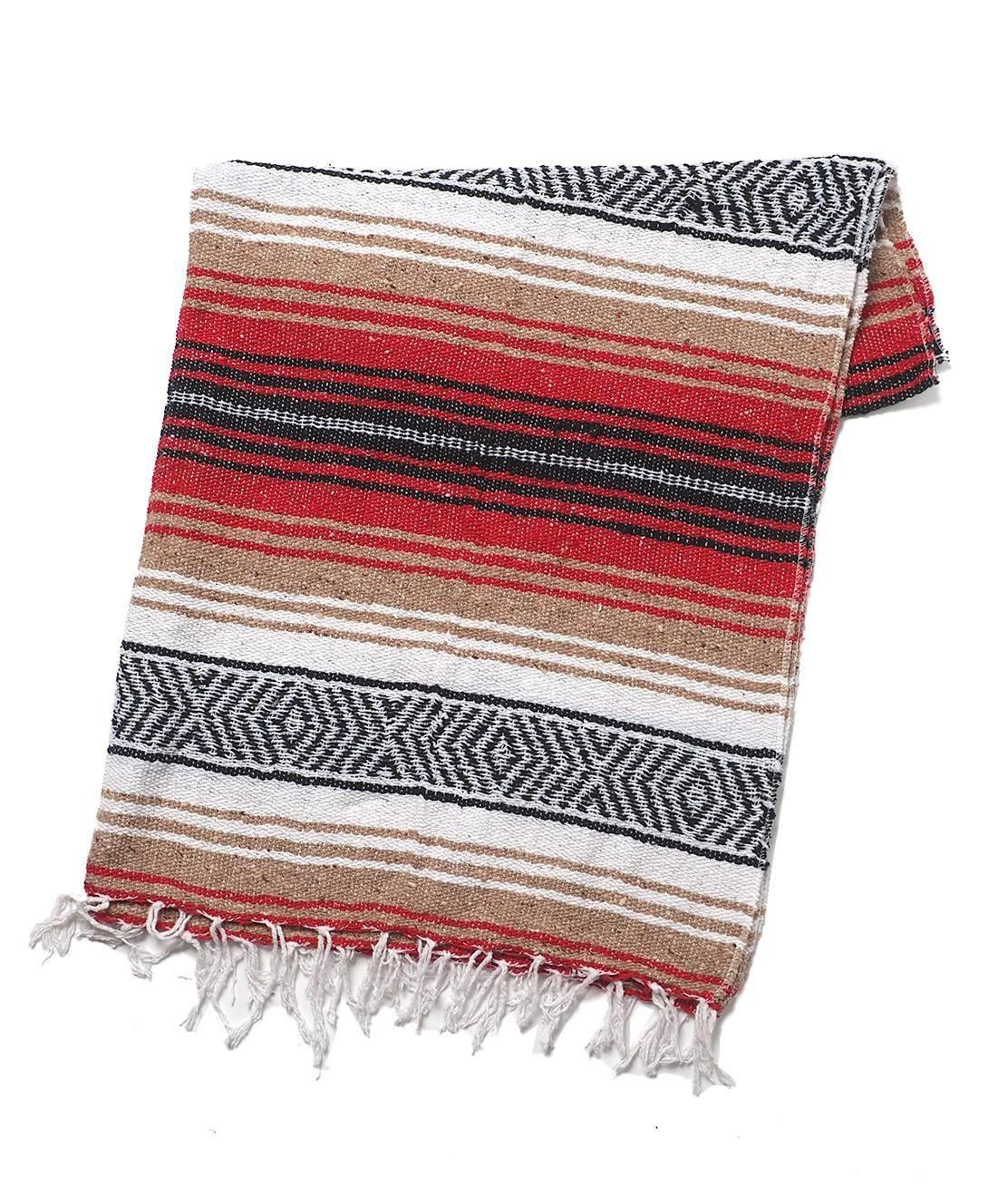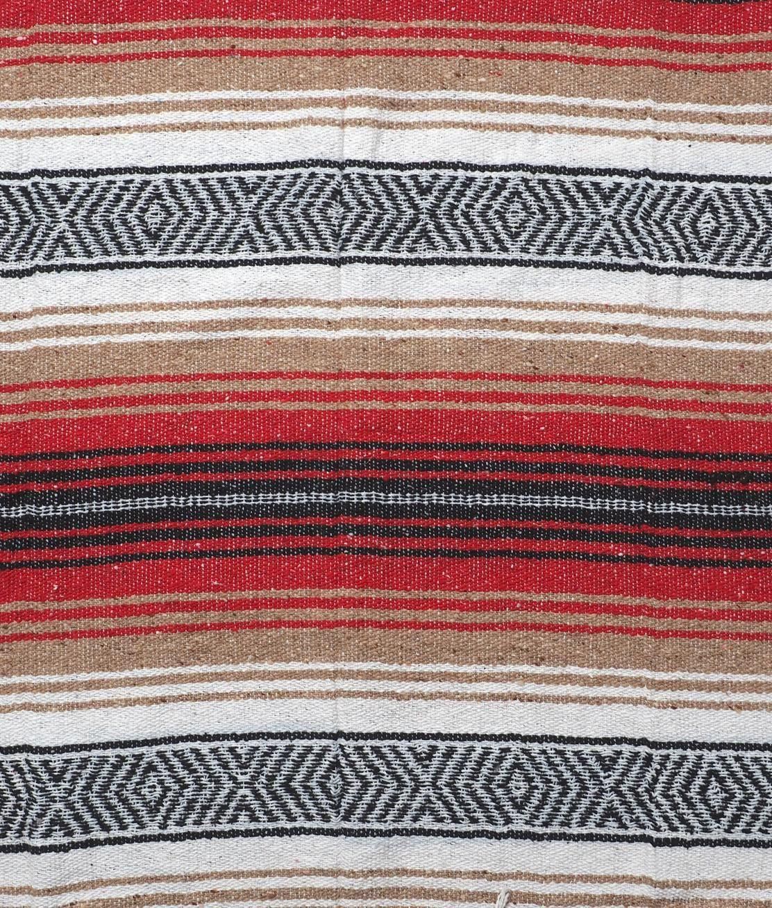 厚手ながら非常に柔らかい作りのファルサブランケット。粗目に織られたアクリル混紡素材は厚手でありながらも柔らかく、シングルベッドほどの大判サイズは、ダイニングキッチンやリビング、ソファーや寝室まで、大きな家具の下に敷いても十分の大きさがあり、アメカジ、サーフなど、雰囲気あるお部屋作りに欠かせないアイテムかと思います。もちろん、屋内インテリアだけでなく、BBQやキャンプ等のアウトドアシーンや、車内の目隠しに使用したりと、幅広い用途で活用いただけます。ブランケットの両端には手結びのフリンジが施されており、手織りならではの温もりのあるデザインも魅力です。