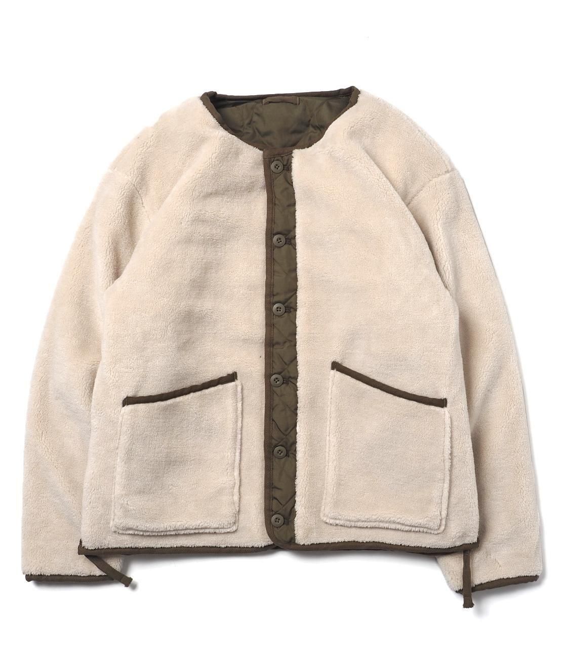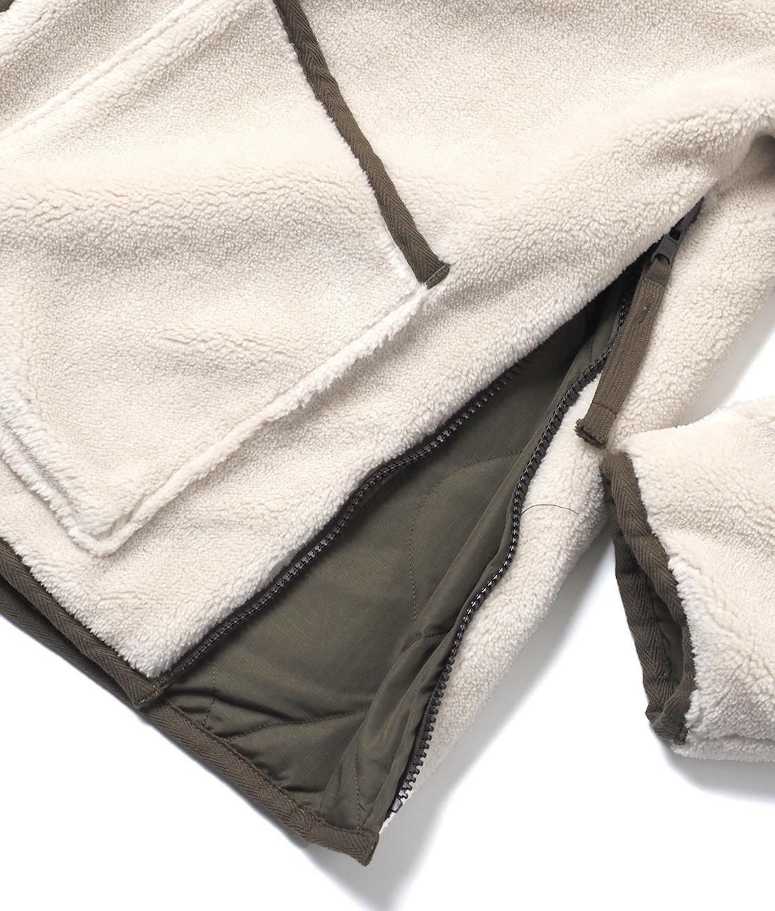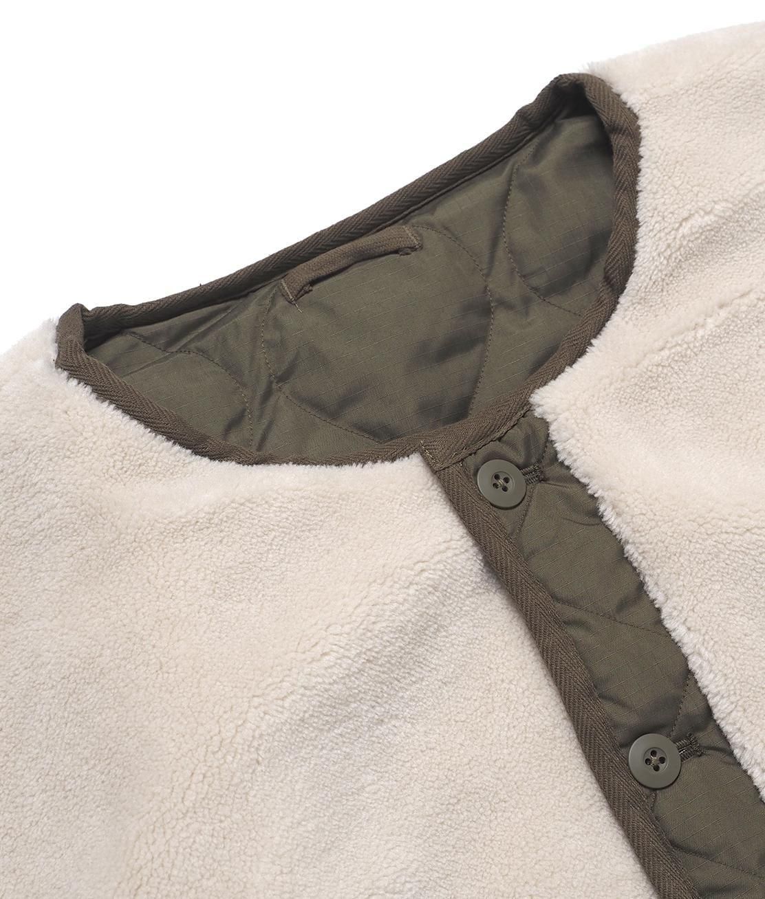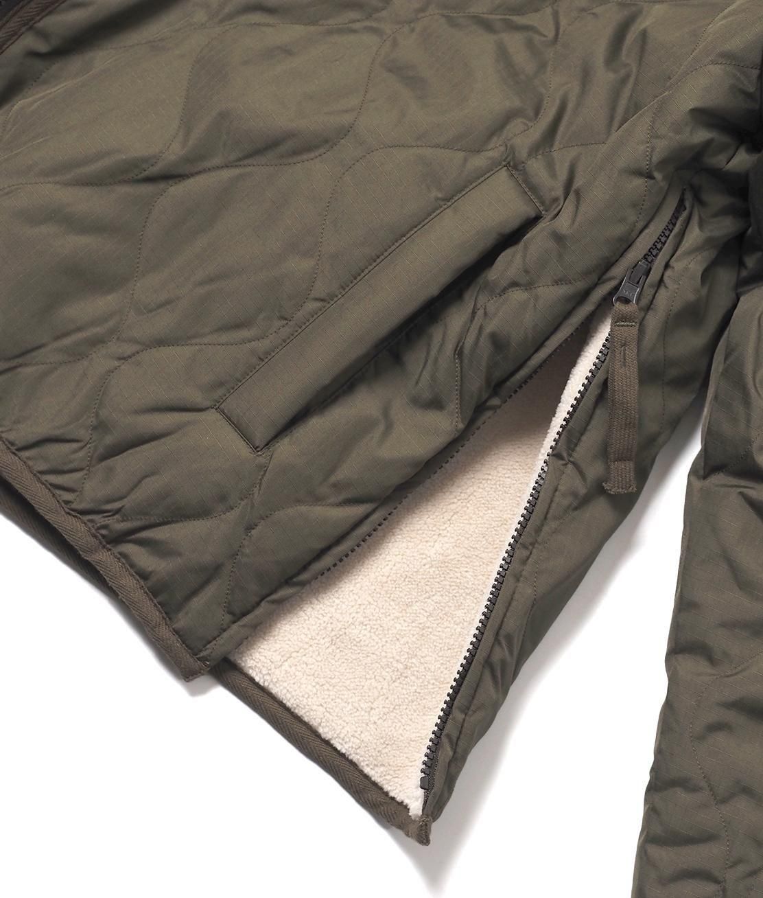 ヴィンテージミリタリーでも人気の高いアメリカ軍のミリタリーライナーをベースに、表側にダウン、裏側にボアフリースを採用したリバーシブル仕様のダウンジャケット。ダウン×ボアの2重構造で、風も通さない防寒性の高さと、表情の異なるリバーシブル仕様で様々な着回しをお楽しみいただけます。Tシャツなどカットソーからシャツ、タートルネック、フーディーと、幅広い重ね着が可能で、両サイドには使い勝手の良いポケットが付属し、両脇スリットファスナーは可動域が広がることで動きやすくなり、ボトムスのポケットにも手を入れやすく、インナーがチラ見えしてオシャレ感もアップします。中綿ダウンは軽く反発力に優れた800flp以上を使用しており、耐久性の高い5mm角のリップストップポリエステル生地はデイリーに気兼ねなくガシガシと着用をお楽しみいただけます。