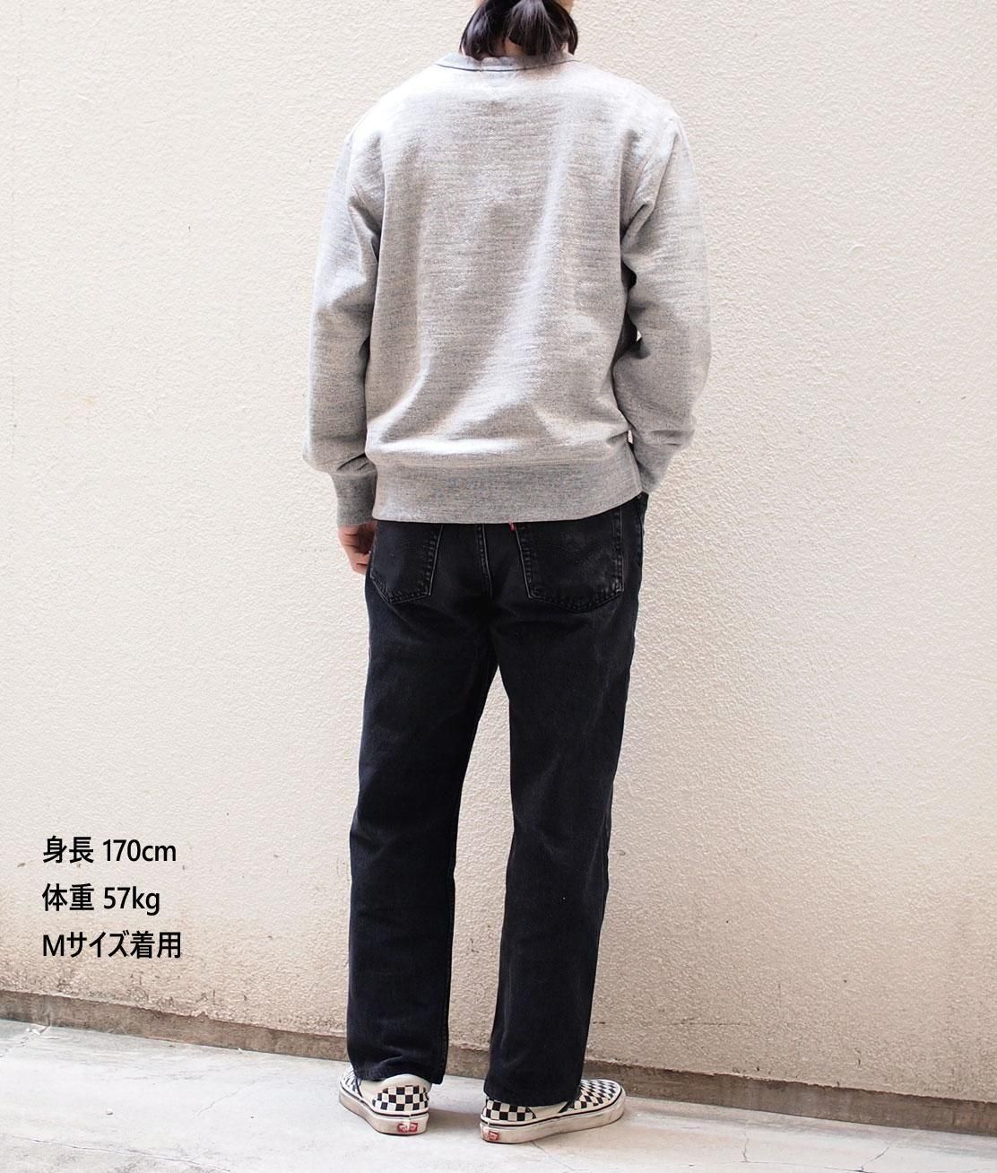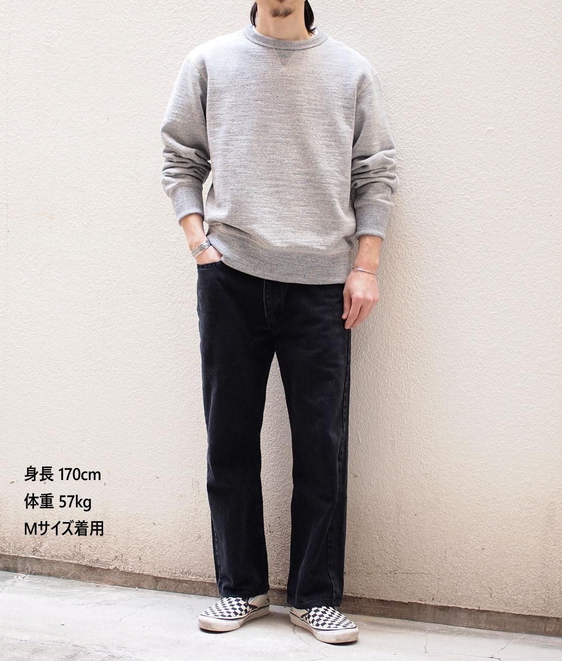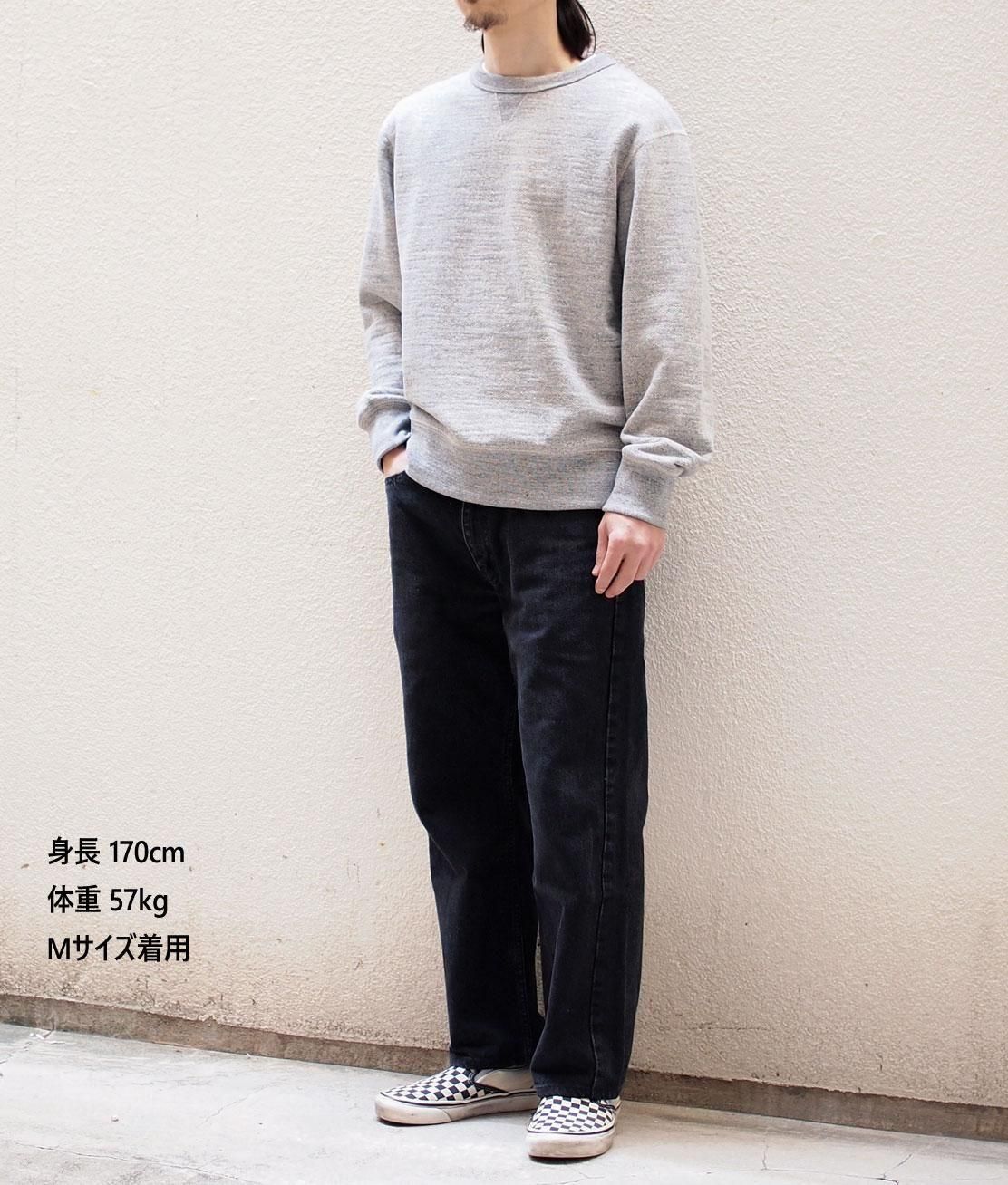 太い番手の国産糸を使用して日本国内で編み立てたブランド定番のGG(ガラガラ)裏毛素材のクルーネックスウェット。2022年より着心地を良くするために身頃と肩幅を広げ、肩の傾斜を付けることで腕を下げた際の窮屈感を解消しました。アームホールにもゆとりを持たせ、袖付けや脇下など主要部分をフラットシーマ縫製に変更して肌あたりを向上させています。首元のガゼットを前後に配して頭を通す際の伸縮性を高める一方で伸びを防止します。日本国内に数台しか存在しない明治初期に考案された日本独自の紡績機『ガラ紡』でゆっくりゆっくりと糸を紡いで生地を編み立てており、しっかりとした厚手でありながらもフンワリとした柔らかさや、独特の凹凸とした風合いが魅力です。