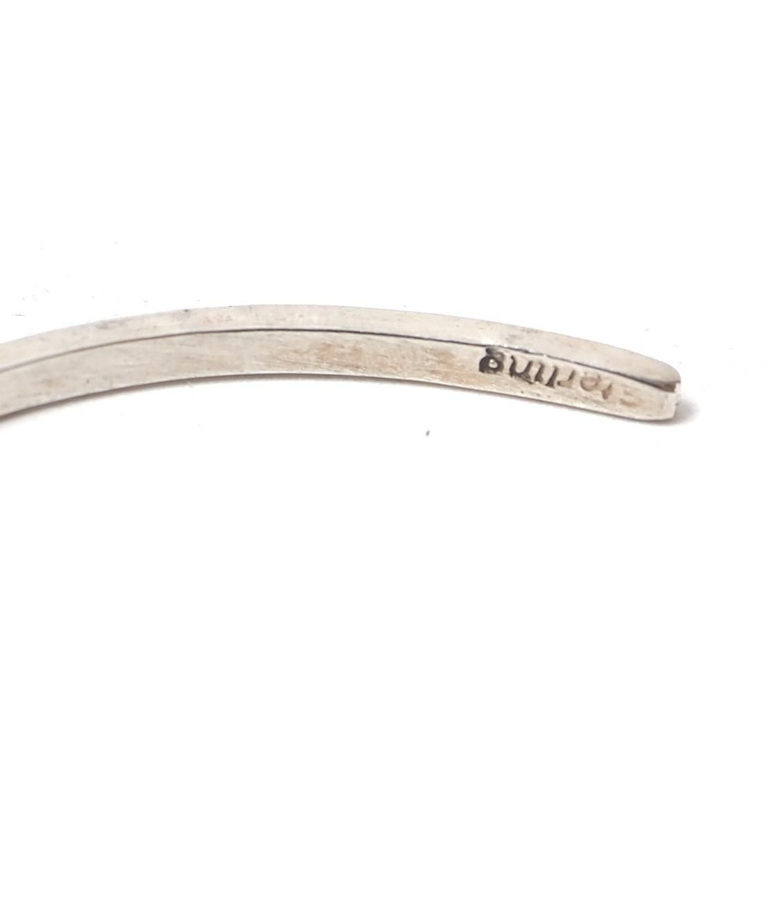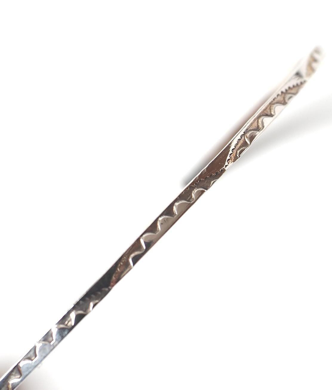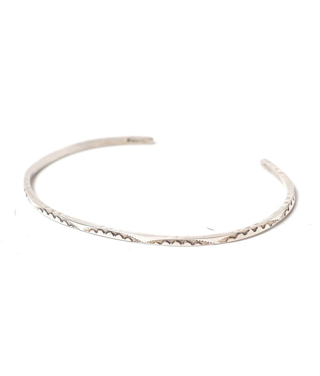 タガネと呼ばれる道具で柄を打ち付けてデザインを作るスタンプワークが特徴のナバホ族は、銀細工を最も始めに行ったとされているネイティブ・アメリカンで、アメリカ大陸に残る最大の部族と言われています。こちらは四角形の形状が特徴のシルバーバングルで、幅は1.5mmと細身のナロータイプですので、時計や他のブレスレット等との重ね着けも楽しめる人気のアイテムです。両辺には幸福を守るスタンプワークが入れられたシンプルなバングルですので、さり気なくインディアンジュエリーを楽しみたいという方にもお勧めです。