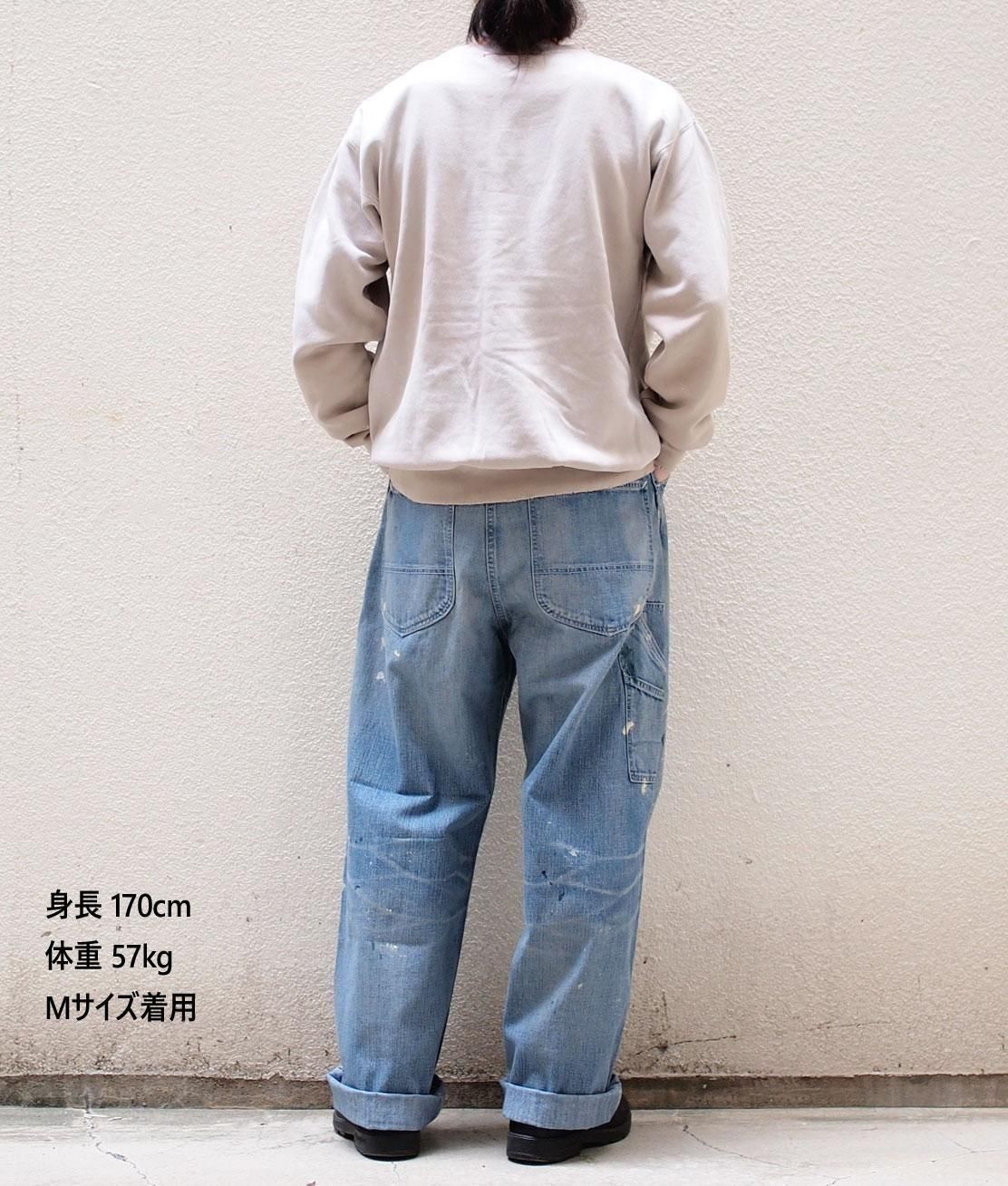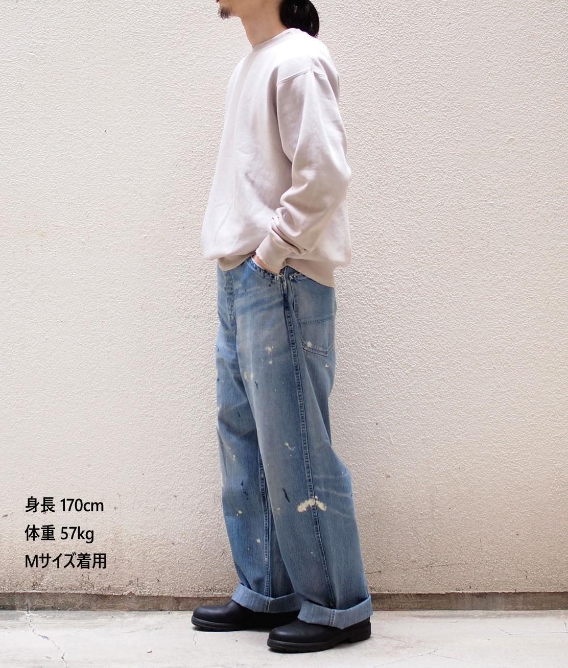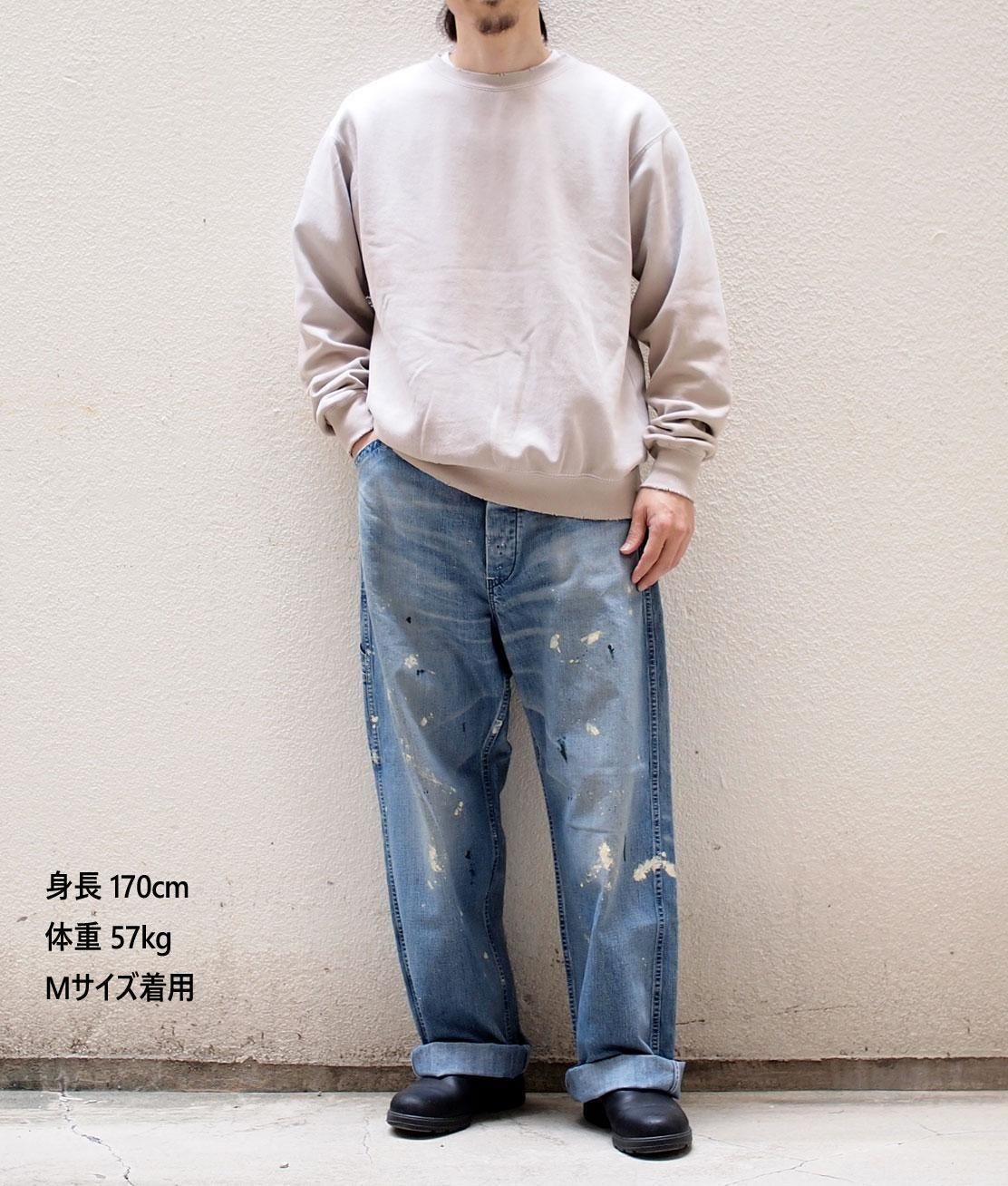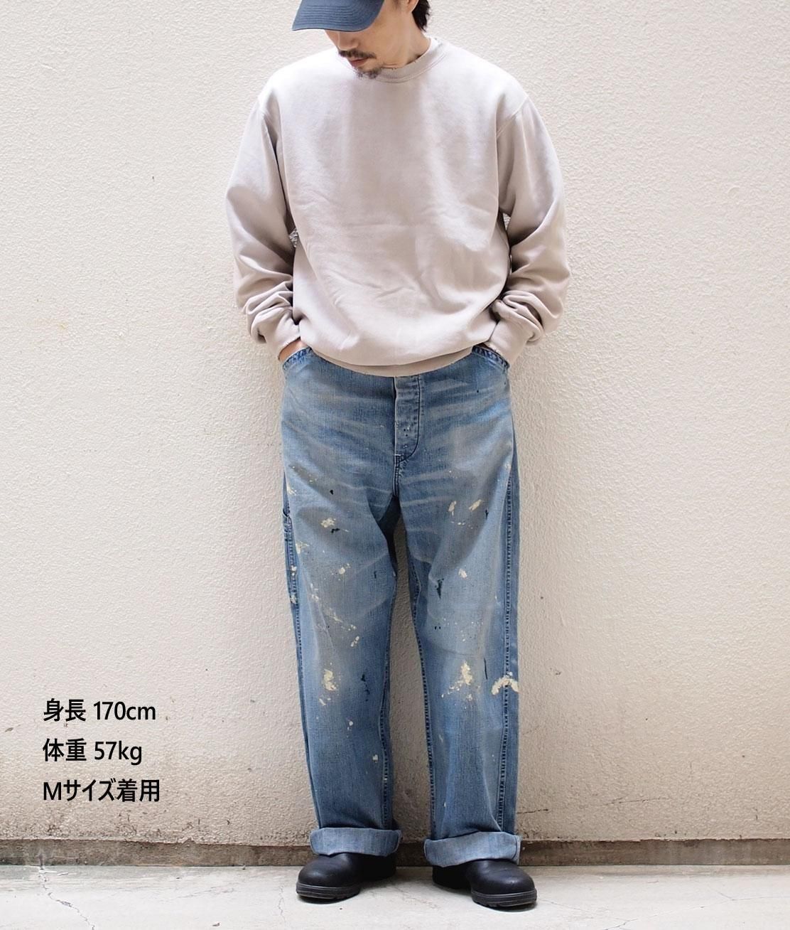 9.5オンスのライトウェイトな裏起毛スウェットボディーを使用したクルーネックスウェット。ボディー全体に日焼けによる色褪せた風合いが表現されており、ネックや袖、裾のリブにはほころびたダメージが加えられ、長年着古したようなヴィンテージ風の雰囲気が抜群です。また、フワッと軽くソフトで肌触りの良いスウェット生地は着心地も良く、秋や春は一枚で、冬はインナーとして幅広いシーズンで着回しが楽しめます。身幅や肩幅にゆとりを持たせたシルエットが古着感のあるリラックスした雰囲気となり、シンプルに一枚で着ても様になるスウェットです。襟タグの縫製を赤いステッチで入れることでオリジナリティーとアクセントがプラスされています。