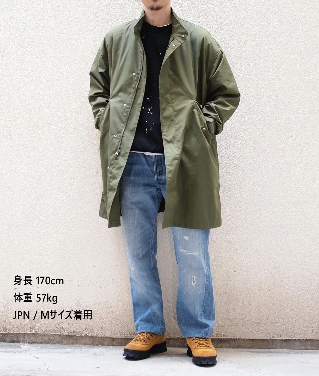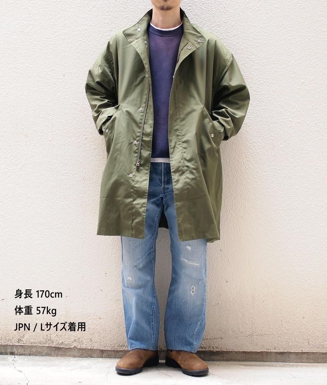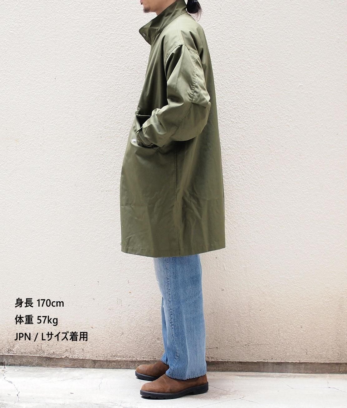 春先や秋冬の羽織りとして幅広いシーズンで使用機会の多い新作モッズコート。1979年に登場したトレイルパーカーと同素材の「ポリエステル65%、コットン35%」を使用し、朝晩が冷え込む季節の変わり目やちょっとしたお出かけの際にサッと羽織りやすいコートです。アメリカ軍の名作『M-65 フィッシュテールパーカ』をベースに、ゆったりとした身幅と肩幅、袖回りでラフに羽織ったり、秋冬はインナーダウンを活用してオーバーコート的な着回しも楽しめます。袖口はマジックテープとゴムで調節がしやすく、軽い着心地ながらもパリッとした質感の生地は軽快で都会的な雰囲気があり、色々なアイテムとのレイヤードがお楽しみいただけます。
