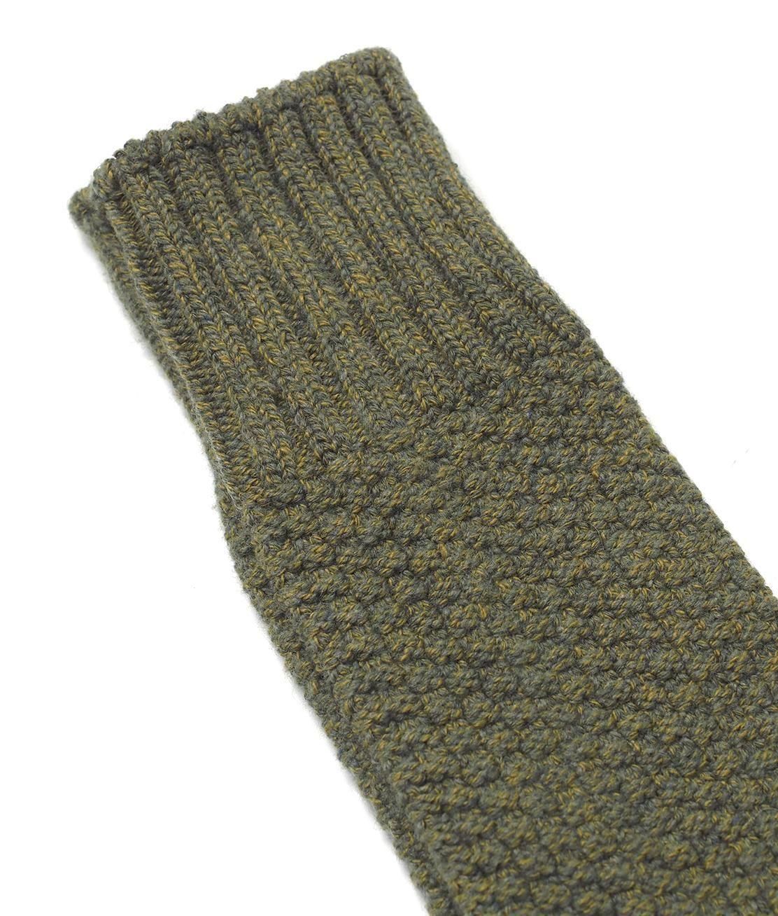 ウールの洋服を糸に戻したリサイクルウールと、落ち綿のヴァージンコットンのリサイクルコットンをブレンドした環境にも優しいウール×コットンブーツソックス。ふっくらと厚手に編まれたソックスは程よいボリューム感と通常よりも丈夫さがウリで、デイリーユースはもちろん、キャンプやトレッキングなどのアウトドアシーンにもお勧めです。ハンドニットのような特徴的な編地が足元にさり気ないアクセントを加えてくれます。ウール素材が持つ高い保温性と、コットンの優しい肌触り、厚手なのでクッション性も良く、履くほどにウール素材が毛羽立って特徴ある風合いが楽しめます。ブーツソックスの名称ですが、スニーカーやサンダル、レザーシューズやブーツなど、幅広いシューズとの相性も楽しめます。「MOSS GREEN(モスグリーン)」は2025年のシーズン限定カラーです。